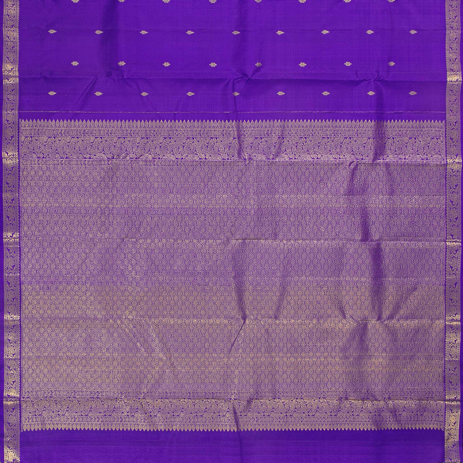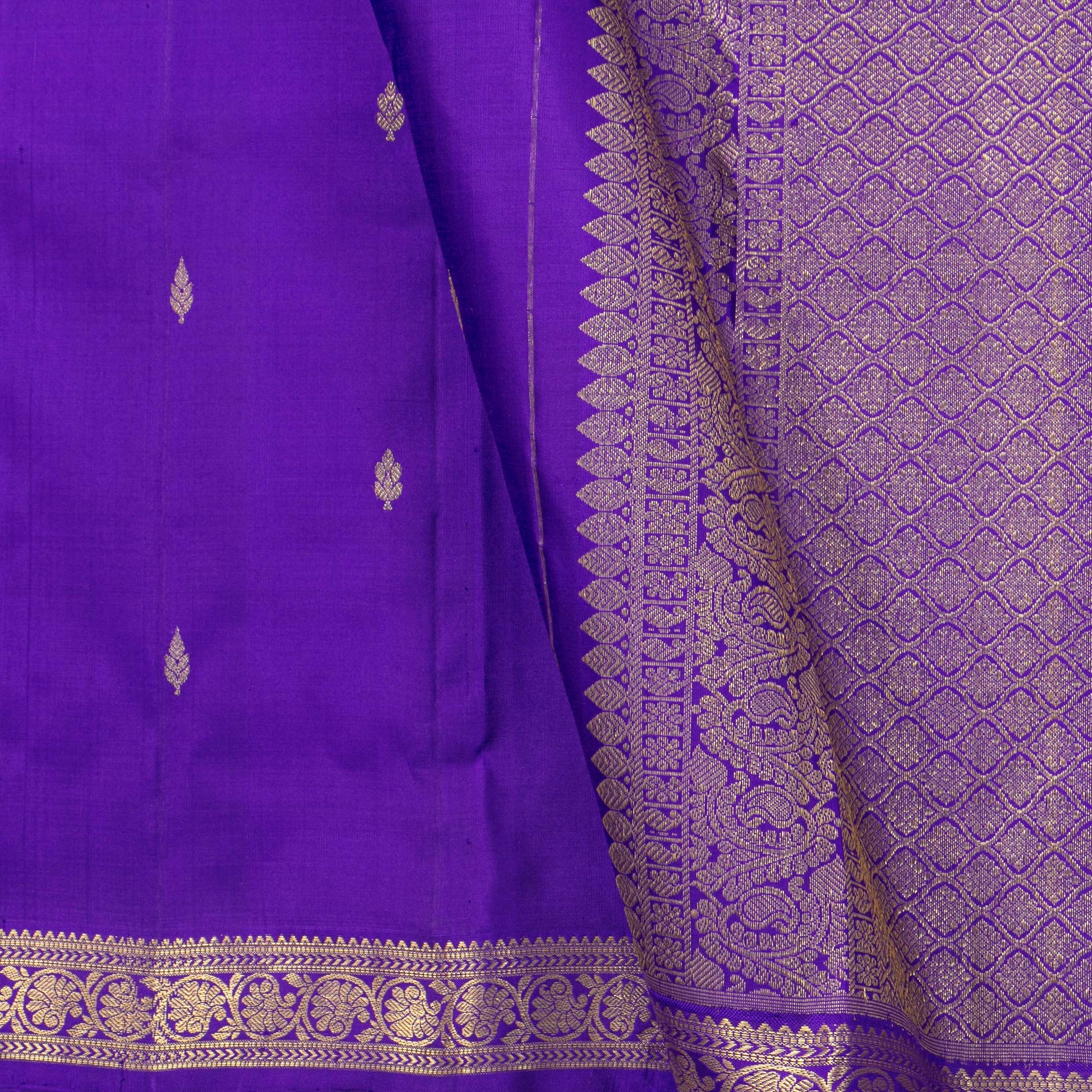 Violet kanchipuram silk saree handwoven in pure silk. The body is in violet with floral motifs in gold zari. The border and pallu has floral pettu in gold zari. The attached blouse is in violet with armband matching the saree border.