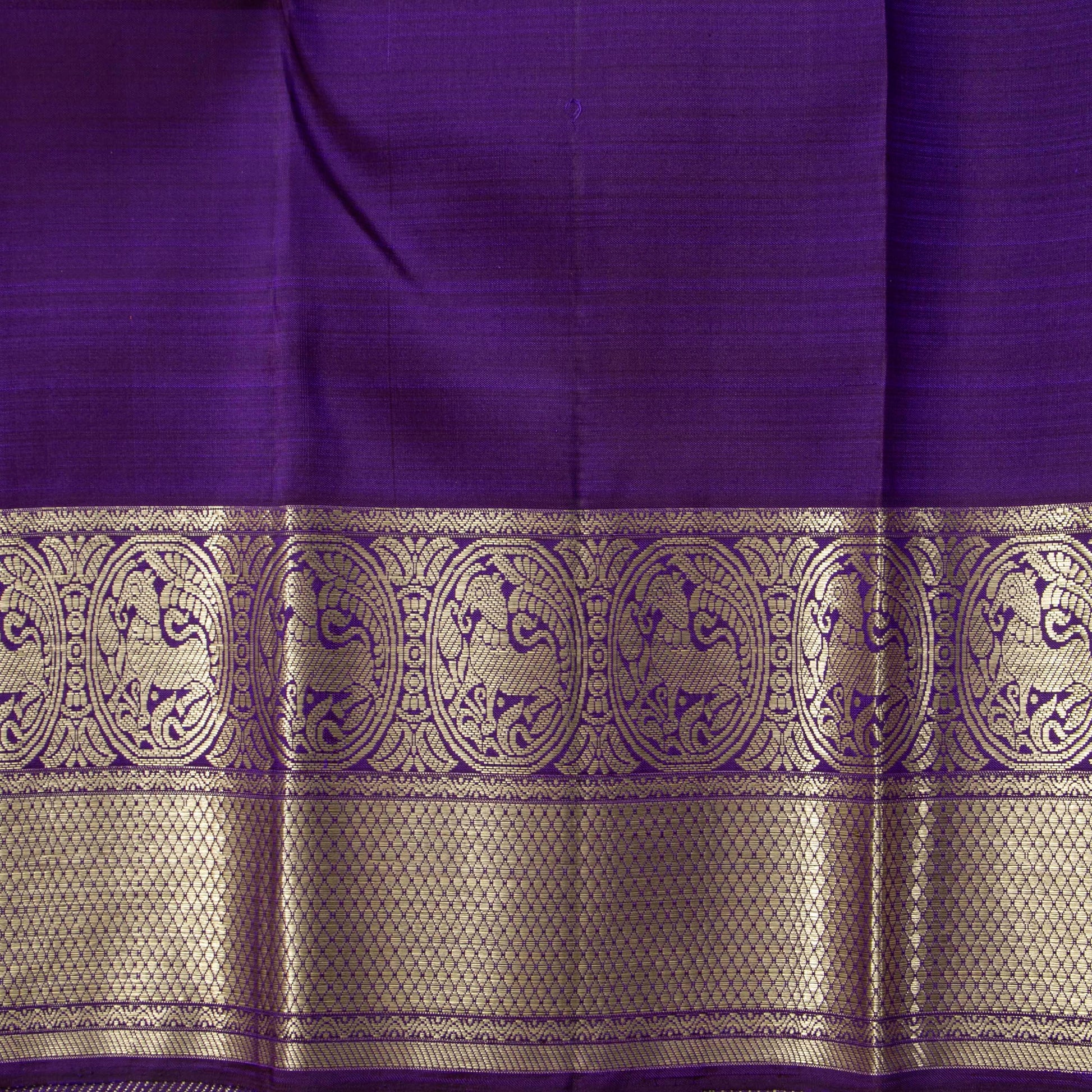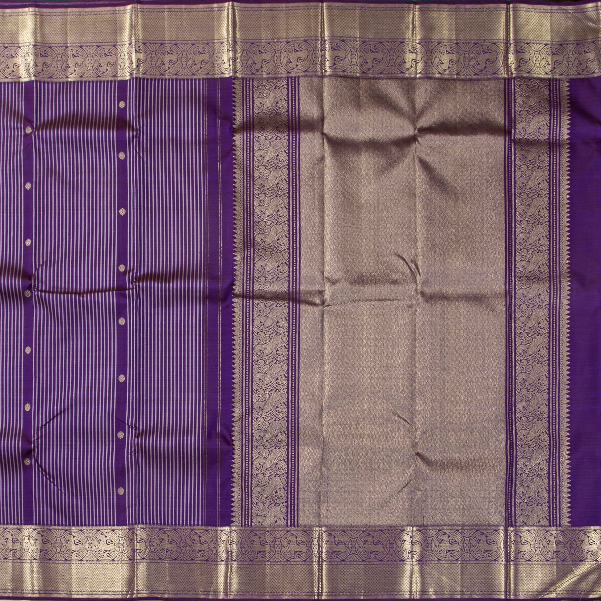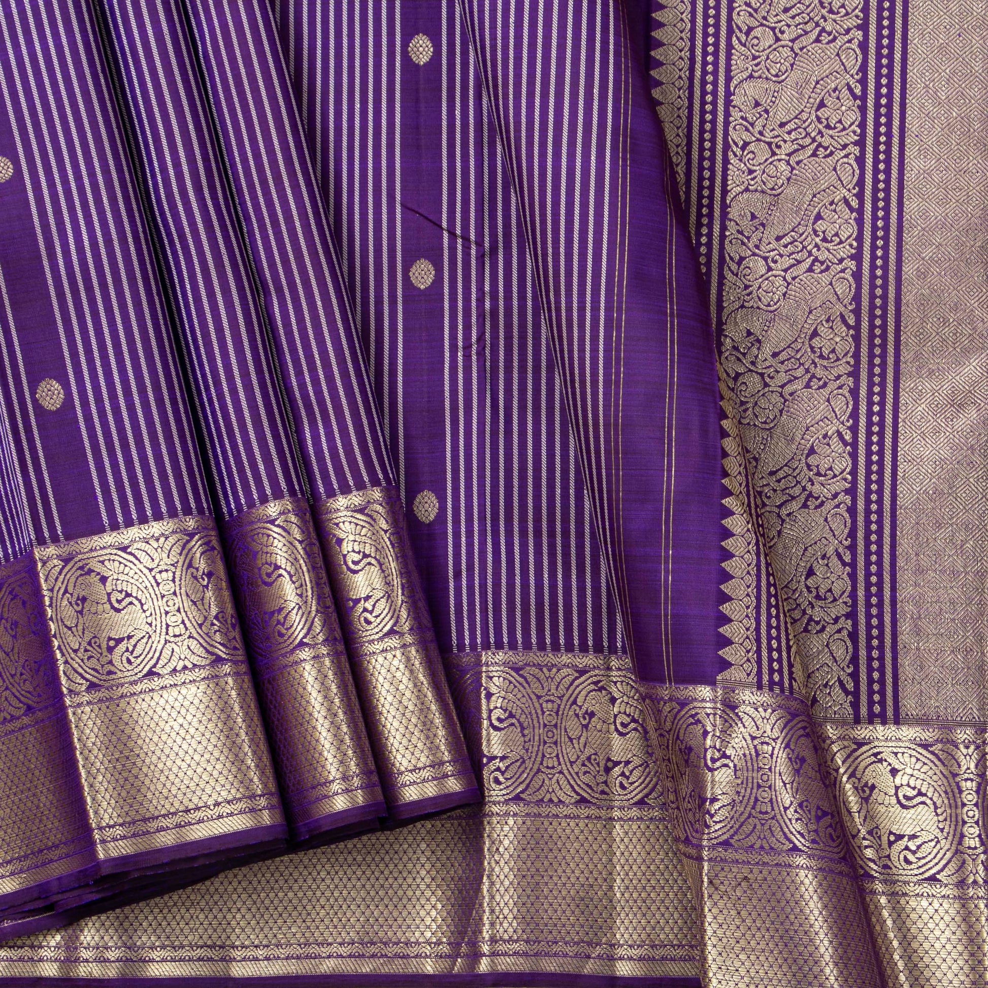 A violet handwoven kanchipuram silk saree in pure silk and pure zari. The body is in violet with vertical stripes and kamalam motifs in gold zari. The border has elephant pettu and diamond patterns in gold zari. The pallu has horse and diamond patterns in gold zari. The attached violet blouse has gold zari work matching the borders for the blouse sleeve.