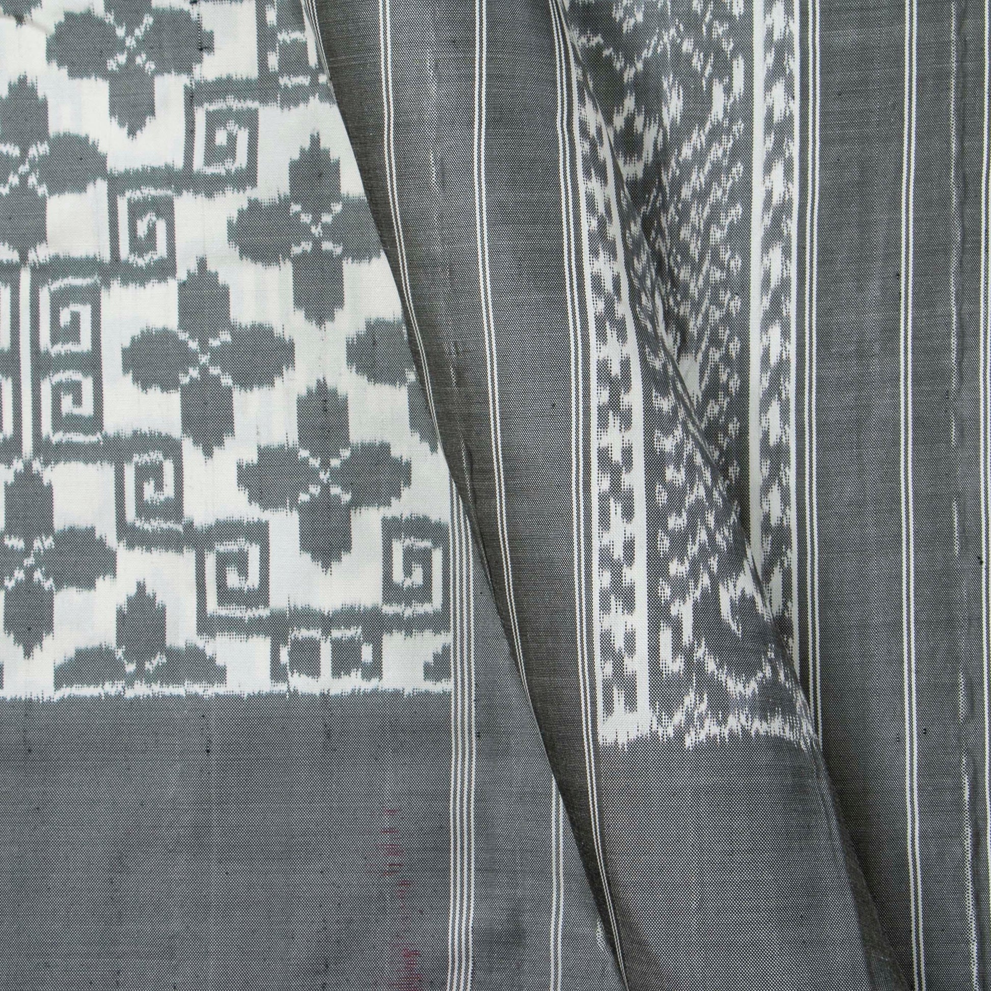 White and grey double ikkat pochampally silk saree handwoven in pure silk using the tie and dye technique. The attached blouse is in grey.