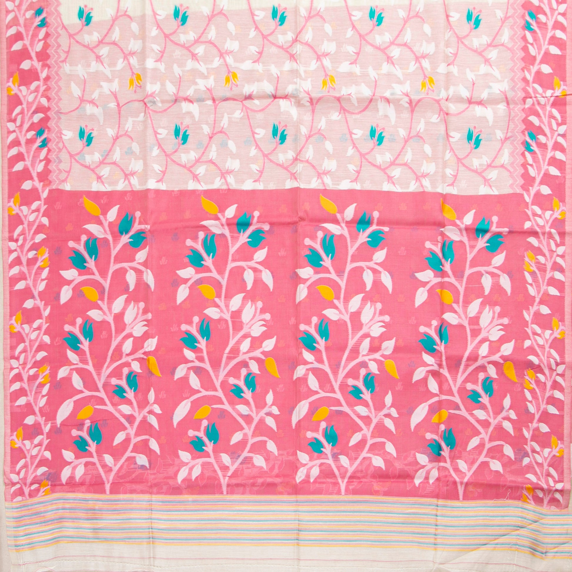 White and pink bhishnupuri tussar jamdani silk saree with attached blouse