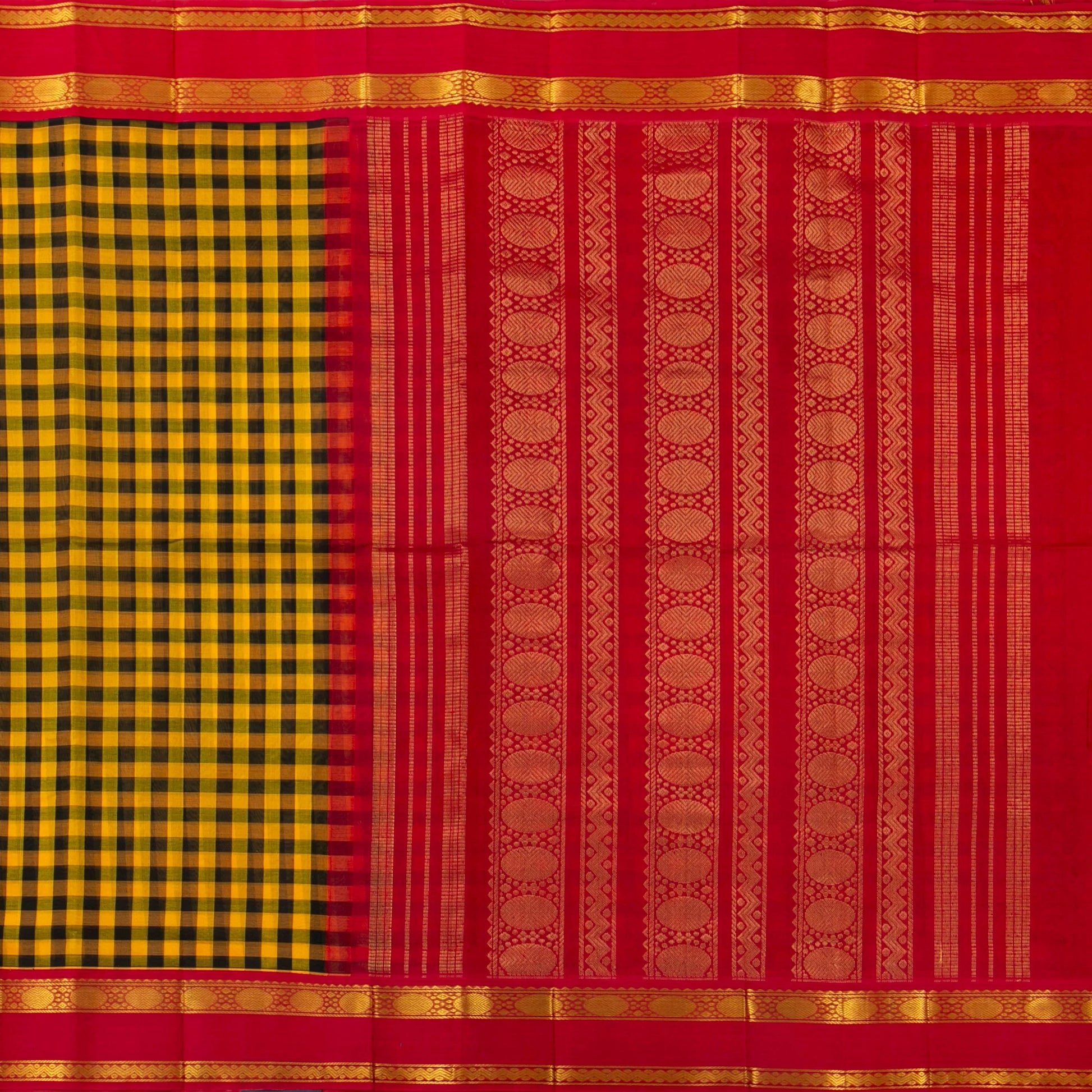 Yellow and black checked kanchi silk cotton sari with red korvai rettai petu border having with rich gold zari work with rudraksham and chevron designs. The red pallu has columns of rudraksham motifs in gold zari. The red blouse has a zari arm band matching the saree border.