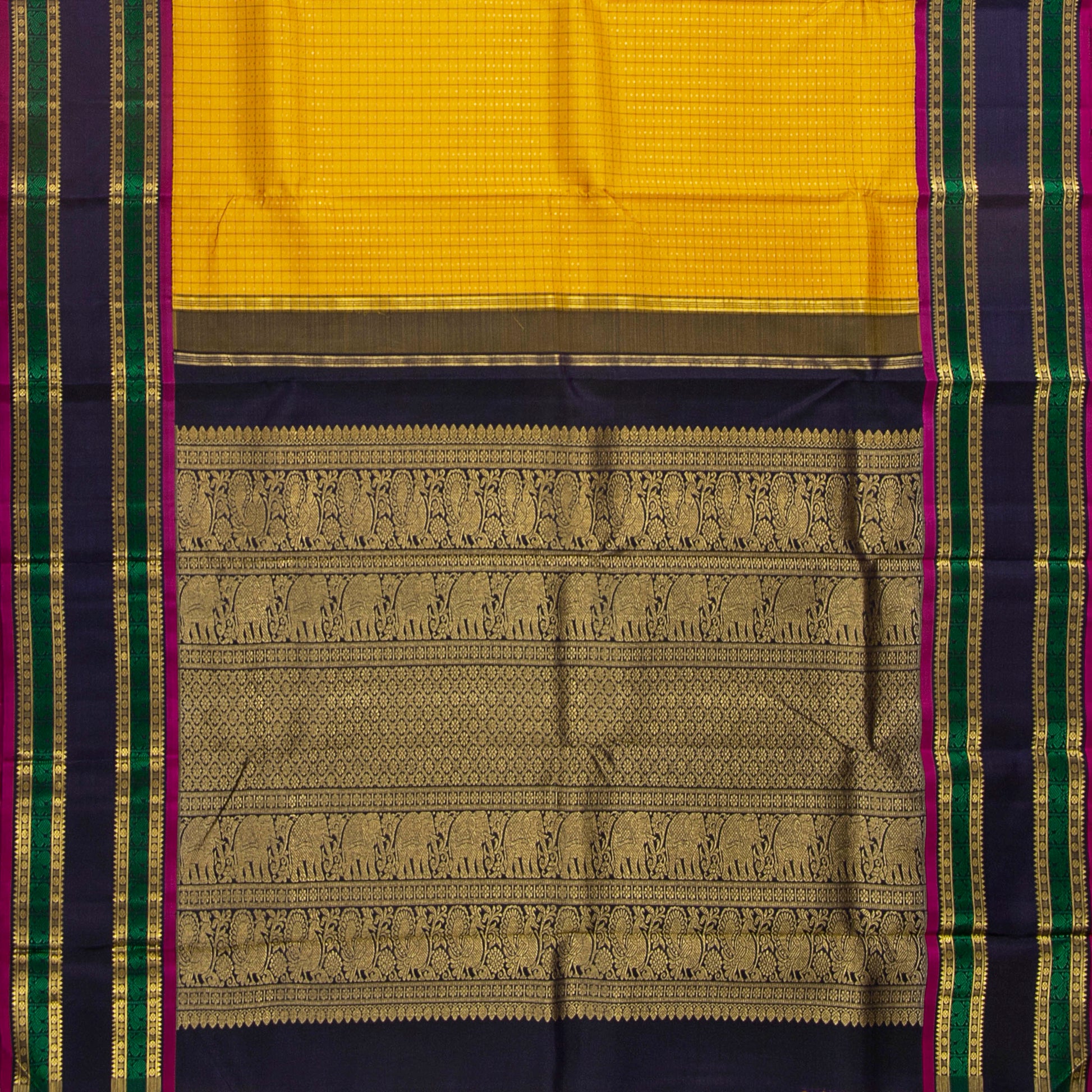 A yellow blue kanchipuram silk saree handwoven in pure silk and pure zari . The body is in yellow with blue checks enclosed with zari bhutties. The korvai magenta rettai pettu border has peacock pettu in green silk thread and rudraksham motifs in gold zari. The blue pallu has peacock, elephant and floral patterns in gold zari. The attached blouse in blue has a zari band matching the saree border.