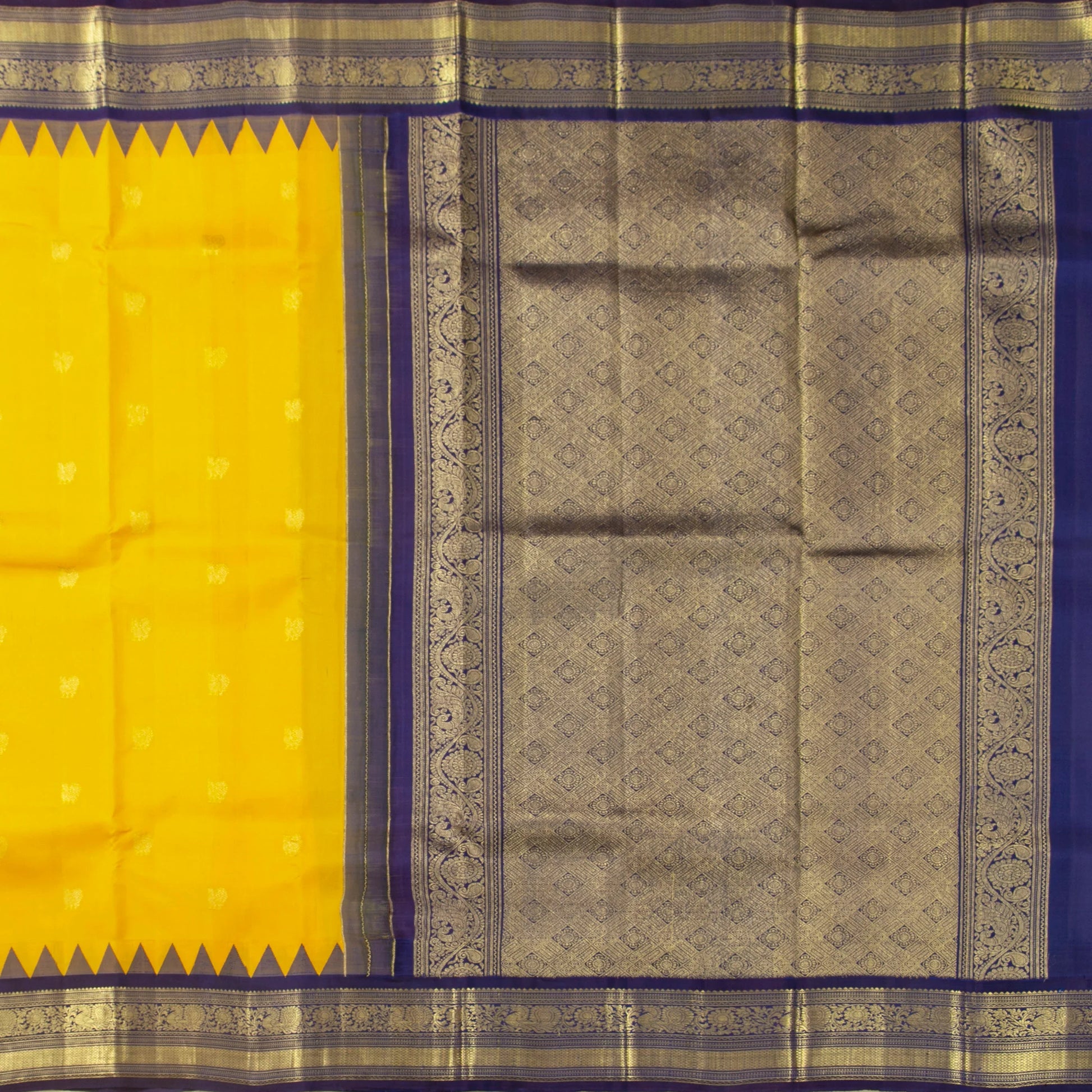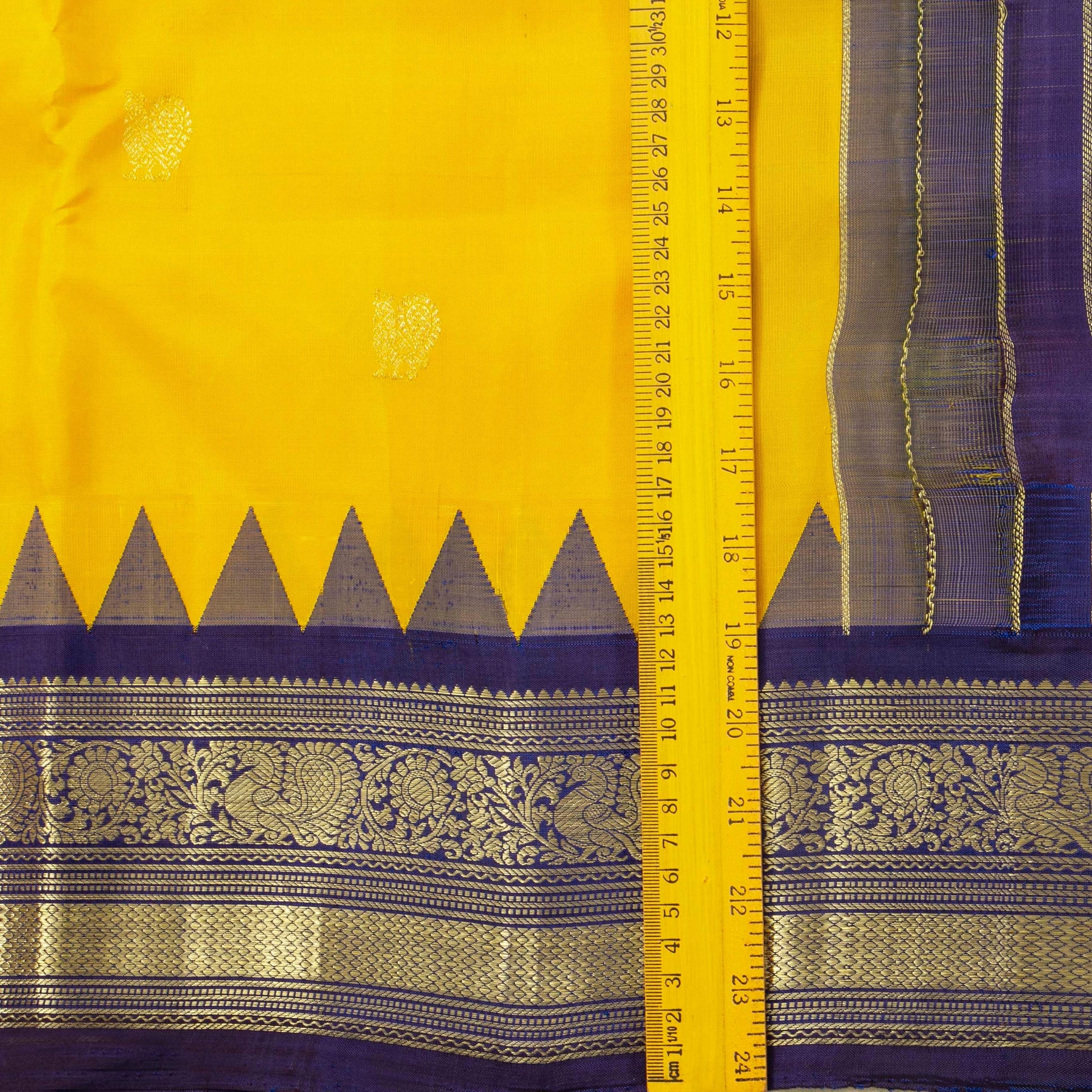 A yellow and navy blue original kanchipuram silk saree handwoven in pure silk and pure zari. The body is in yellow with peacock motifs in gold zari. The temple korvai navy blue border has peacock and chevron pettu in gold zari. The navy blue pallu has floral and diamond patterns in gold zari. The attached blouse is in navy blue with a zari armband matching the sari border.