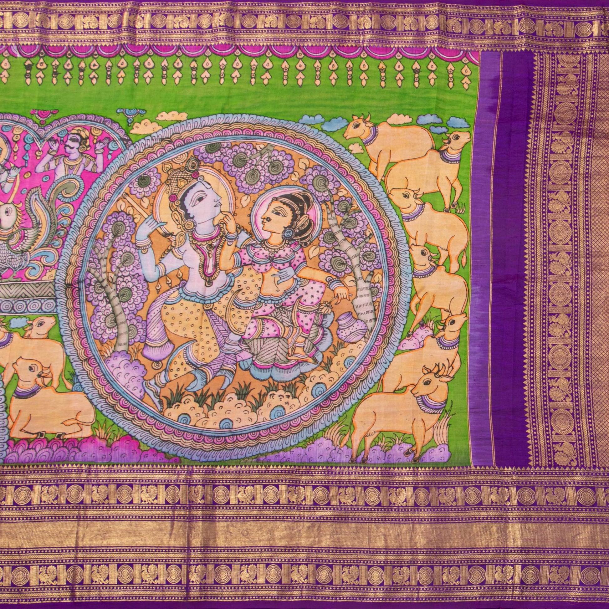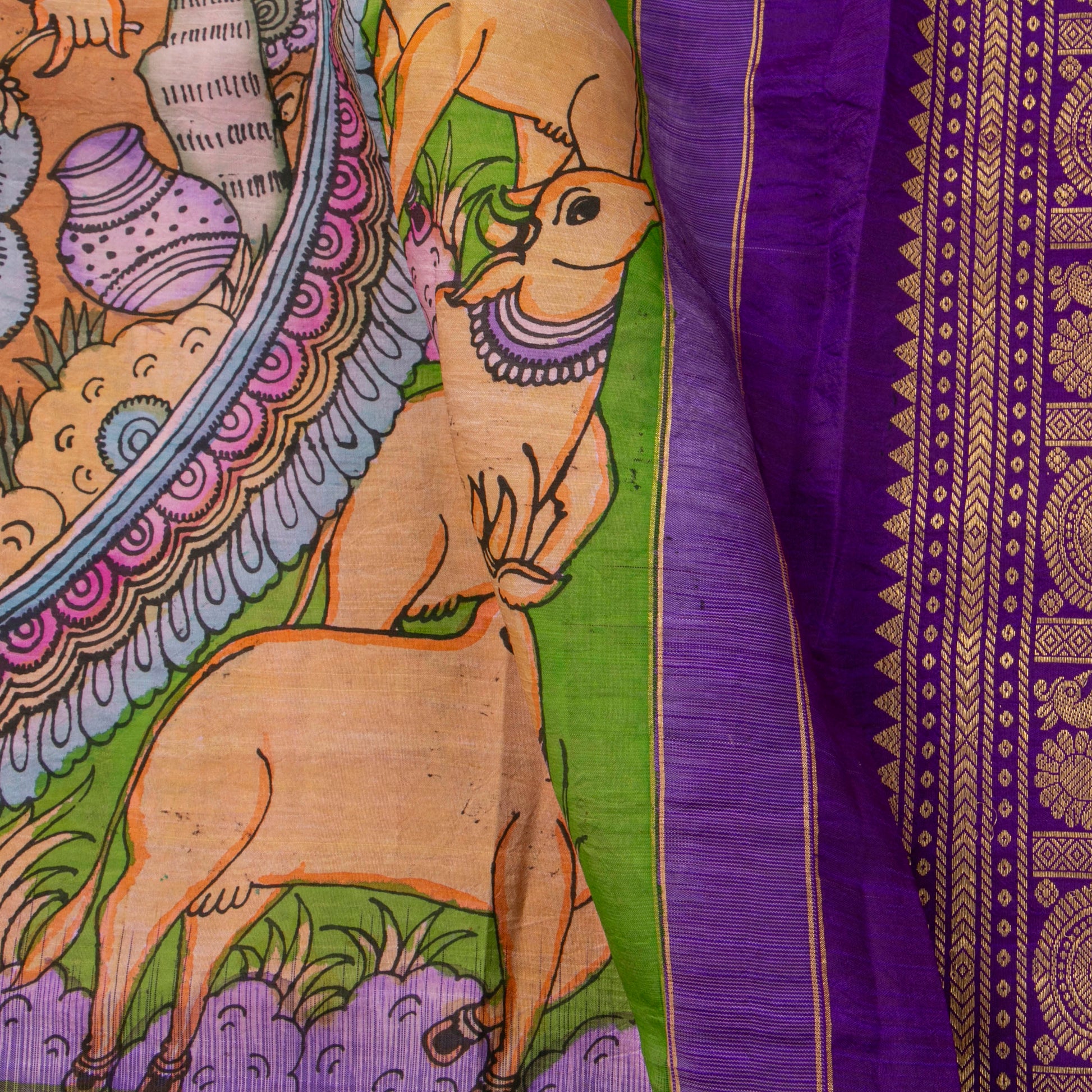 Yellow handpainted pen kalamkari on a kanchipuram pure silk saree using organic vegetablle dyes. The body design has Krishna Leela set in nandavanam as the theme. The morning evening korvai borders of the saree are in purple with gold zari work having rich traditional designs and the pallu has geometric designs in gold zari. The attached blouse in purple has a zari arm band matching the bottom border of the saree.