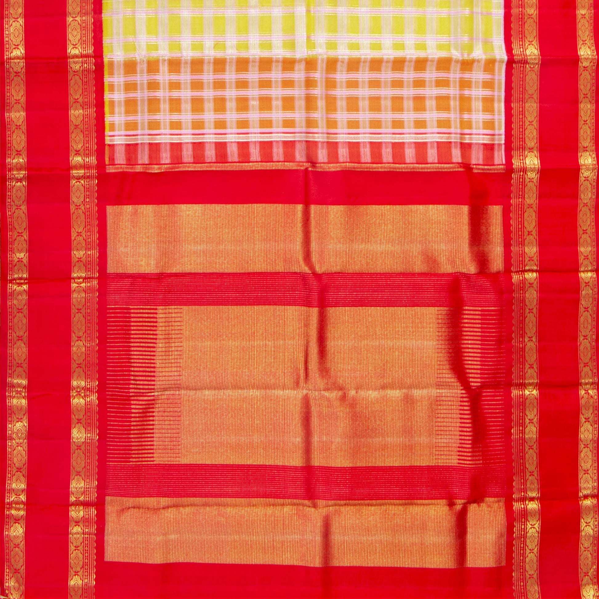 A yellow and red handwoven kanchipuram organza silk saree in pure silk and pure zari. The body is in yellow with checks in silver zari. The korvai red rettai pettu border has floral pettu in gold zari. The pallu has seeppu rekku patterns in gold zari. The attached red blouse has gold zari work matching the borders for the blouse sleeve.