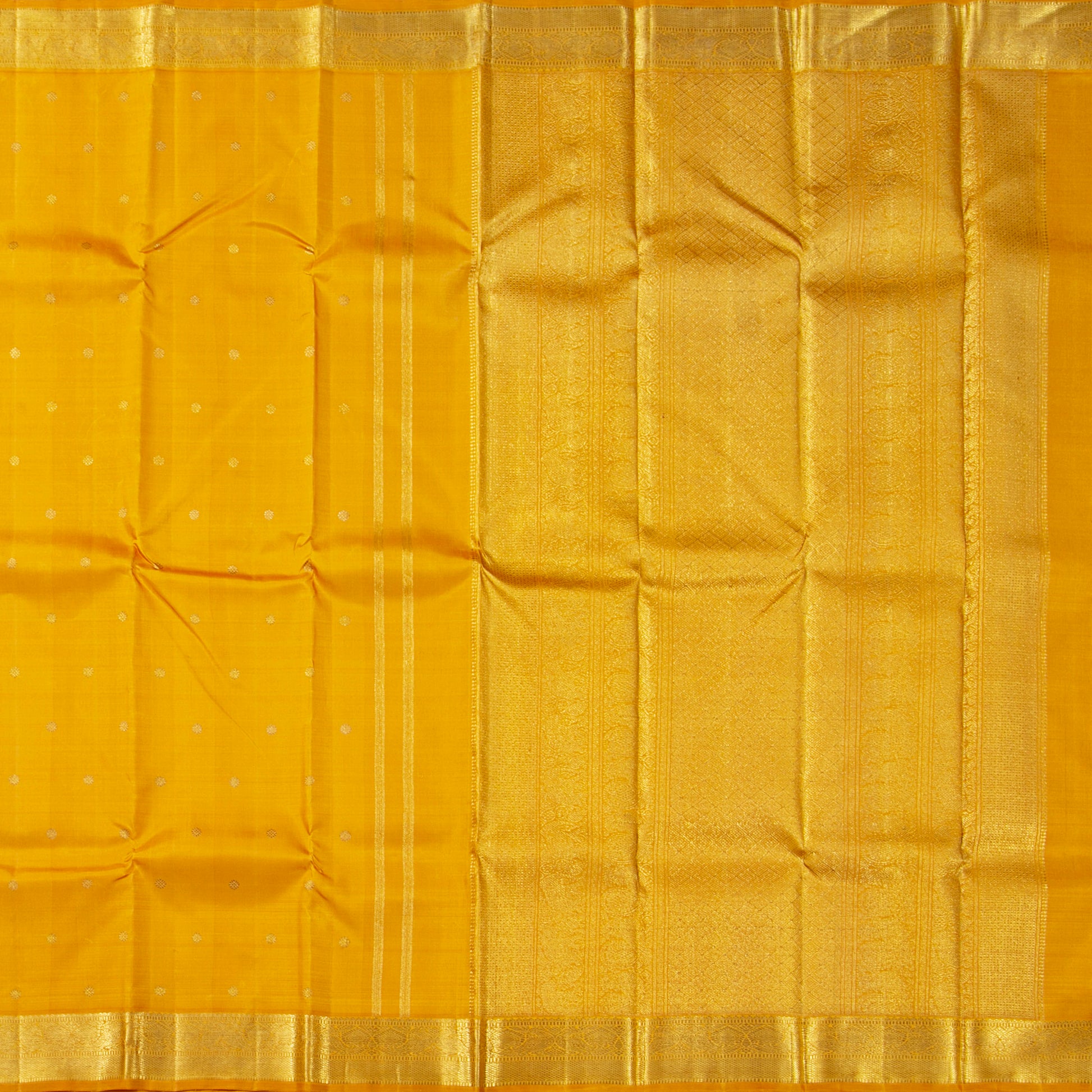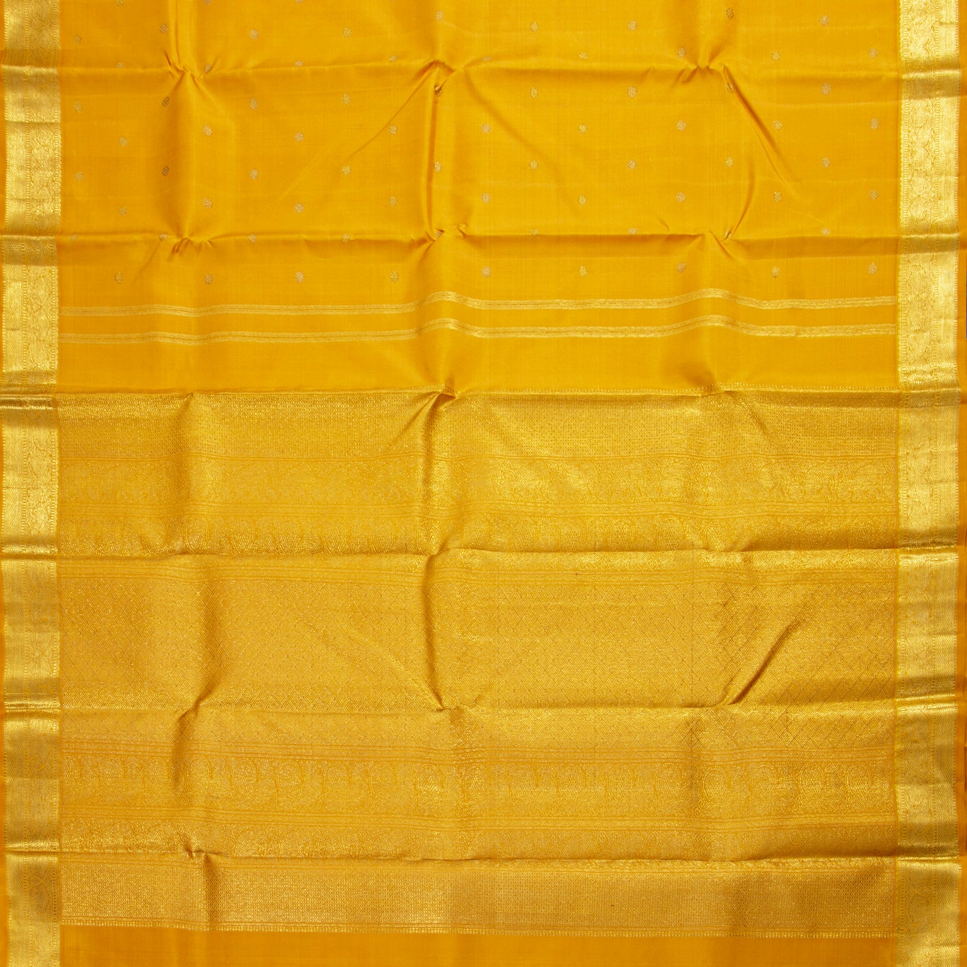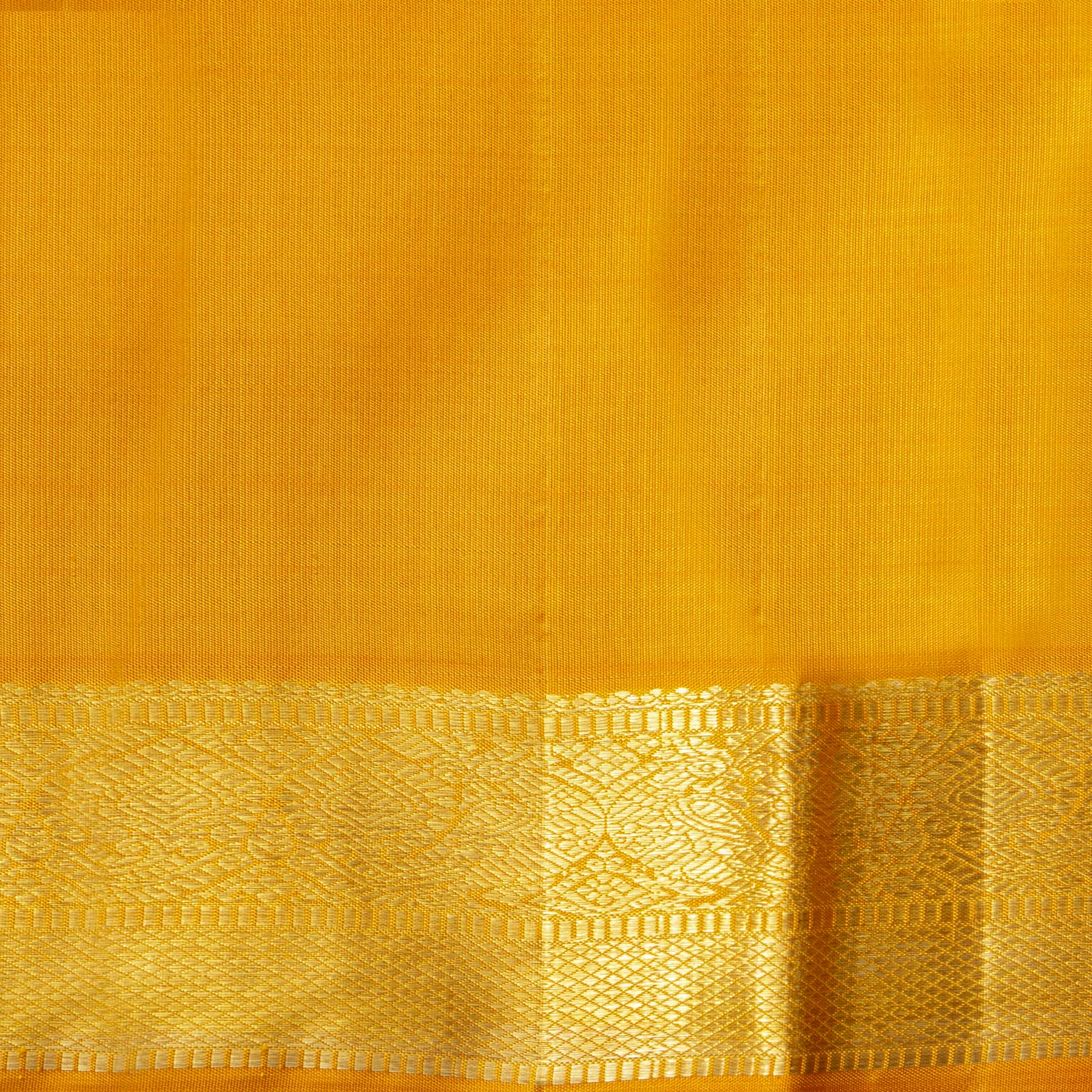 An authentic yellow kanchipuram silk saree handwoven in pure silk with silk mark certificate. The body is in yellow with kamalam motifs in gold zari. The border and pallu has traditional patterns in gold zari. The blouse in yellow has a zari arm band for the sleeve matching the saree border.